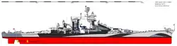 The ship was 808 feet 6 inches (246.43 m) long overall and had a beam of 91 ft 1 in (27.76 m) and a draft of 31 ft 10 in (9.70 m). She displaced 29,779 long tons (30,257 t) as designed and up to 34,253 long tons (34,803 t) at full load. The ship had a flush deck with a flared bow and a rounded cruiser stern. She had a large superstructure that included an armored conning tower with a tall tower mast, along with a smaller, secondary conning position further aft.[1] She carried four OS2U Kingfisher or SC Seahawk floatplanes, housed in two hangars,[2] with a pair of aircraft catapults mounted amidships.[3]