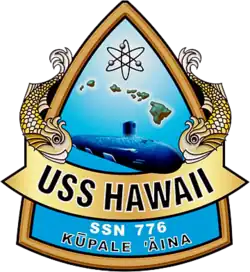 USS Hawaii (SSN-776), a Virginia-class submarine, is the first commissioned warship of the United States Navy to be named for the 50th state. (A previous large cruiser, or battlecruiser, USS Hawaii (CB-3) was launched, but never commissioned, and was named after the Territory of Hawaii.) The building contract was awarded to the Electric Boat Division of General Dynamics Corporation in Groton, Connecticut on 30 September 1998 and her keel was laid down on 27 August 2004. She was christened on 17 June 2006 by her sponsor, Governor Linda Lingle of Hawaii. Electric Boat delivered Hawaii to the US Navy on 22 December 2006, ahead of schedule.[7] She was commissioned on 5 May 2007.[8] In July 2009, she changed home port from Groton, CT (Submarine Group Two, Submarine Squadron Two) to Pearl Harbor, HI (Submarine Squadron One).[9]