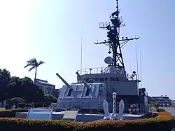 The ship was scrapped in the late 1990s, but part of her superstructure is on display and training ground in the Zuoying Naval Academy, Kaohsiung City.[3][5][6] Another one of her 5-inch gun is on static display at the Kaohsiung Harbor, YM Museum of Marine Exploration Kaohsiung.