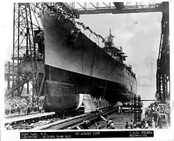 The US Navy awarded the contract for Helena to the New York Navy Yard on 9 September 1935, and the keel for the new ship was laid down on 9 December 1936. Her completed hull was launched on 28 August 1938 and she was commissioned on 18 September 1939 with the hull number CL-50.[2][16][17] World War II had broken out in Europe in September that year, but for the time being, the United States remained neutral. After entering service, the ship was occupied with sea trials and initial training, and she embarked on a major shakedown cruise abroad on 27 December, bound for South American waters. She stopped in Guantanamo Bay, an American-leased naval base in Cuba, on the way before arriving in Buenos Aires, Argentina, on 22 January 1940; from there, she continued on to Montevideo, Uruguay, on 29 January. While in the latter port, the crew inspected the wreck of the German heavy cruiser Admiral Graf Spee that had recently been scuttled after the Battle of the River Plate the previous month. Helena got underway again in mid-February to return to the United States, again passing through Guantanamo Bay on the way. After returning, she was dry-docked for repairs from 2 March to 14 July.[16][18]