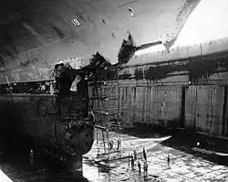Two minutes later, a single-engine aircraft began a suicide run on Hobson from the starboard side. Five-inch shells from the destroyer disintegrated the plane just short of the ship, but its 250-pound bomb penetrated the deck house. The explosion of the delayed action bomb started fires in the gunnery workshop, machine shop and electrical shop and blasted a hole in the deck over the forward engine room, wrecking steam and power lines. Four of her crew were killed and six wounded.[30]