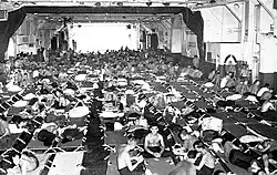 Having completed her duties, she returned to San Diego, arriving on 1 May. Whilst at port, Captain John Thompson Brown, Jr. took over command of the vessel.[11] She then conducted a transport run to Pearl Harbor, ferrying cargo and passengers. On 7 June, she departed the West Coast to serve as a replenishment carrier, supporting the Fast Carrier Task Force in its operations against Japan. Replenishment carriers enabled the frontline carriers to replace battle losses, and to stay at sea for longer durations of time.[12] Hollandia loaded replacement aircraft at Pearl Harbor, and she sailed on 18 June to join Task Group 30.8, the Fleet Oiler and Transport Carrier Group (also known as the At Sea Logistics Service Group). She provided replacement aircraft up until news of the Japanese surrender broke.[8]