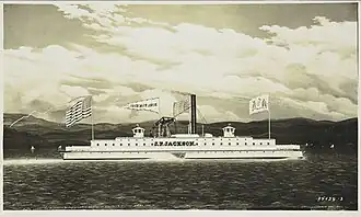 John P. Jackson was built in Brooklyn, New York, in 1860,[1] for use by the New Jersey Rail Road and Transportation Company as a ferry.[2] Construction occurred at the Devine Burtis yard, with the machinery built by Fulton Iron Works. launched on 2 August 1860,[3] and completed in October, she measured 777 gross tons[2] and 750 tons burthen.[3] A sidewheel steamer, the vessel was 192 feet (59 m) long, with a beam of 36 feet 6 inches (11.13 m) and a depth of hold of 12 feet (3.7 m).[4] Power was provided by a 44 inches (110 cm) by 132 inches (340 cm) vertical beam engine.[2] The vessel had a top speed of 8 knots (15 km/h; 9.2 mph).[3] John P. Jackson ferried president-elect Abraham Lincoln across the Hudson River in February 1861, while he was journeying to Washington, D.C. to be inaugurated.[5]