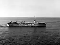 Kula Gulf took part in Marine Corps helicopter training exercises held at Vieques Island, Puerto Rico in May 1952. In October, she served as part of the anti-submarine screen for a group of troop ships sailing to Newfoundland and Labrador in Canada. After returning to the United States, she underwent a modernization that began in January 1953 and lasted until July. She thereafter returned to anti-submarine training exercises off the East Coast of the United States and in the Caribbean Sea. These maneuvers continued for the following two years, during which time Kula Gulf helped to develop anti-submarine tactics to counter the threat of Soviet submarines. She also participated in training exercises used to test helicopter assault tactics being developed by the Marine Corps. She took part in a major exercise to test the so-called "vertical assault" doctrine at Vieques Island that lasted from February to April 1955.[6] The doctrine envisioned using escort carriers to launch helicopters carrying marines and heavy equipment to seize strategic crossroads inland from the invasion beach, while traditional amphibious forces went ashore.[7]