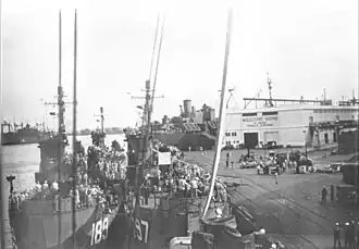 ![]() LSM(R)-189 and LSM(R)-197, two of the seven LSM(R)s comprising Groups 53 and 54 arriving home at the Port of Los Angeles, 8 October 1945, after the conclusion of World War II.