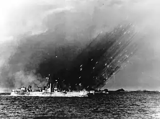 ![]() LSM(R)-196 (foreground), LSM(R)-190 (middle) and LSM(R)-199 (background) firing rockets off Tokishi Shima, March 1945