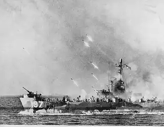 ![]() LSM(R)-197 firing rockets at Okinawa, sometime between 26 March and 18 June 1945.