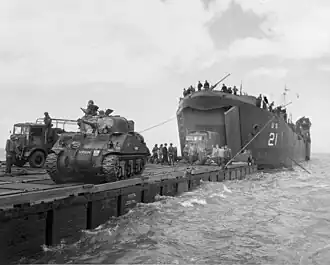 ![]() USS LST-21 unloads British Army Sherman tanks and trucks onto a "Rhino" barge during the early hours of the Normandy invasion, 6 June 1944. Note the nickname "Virgin" on the "Sherman" tank at left.