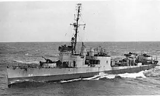 On 24 December 1943, the task group was caught in a storm in the North Atlantic when at 01:58 in the morning, Leary made a ping on a U-boat off her starboard bow. After her commander, James E. Kyes, ordered her to battle stations but before the destroyer could react, she was struck by a G7es torpedo fired by the German submarine U-275. The torpedo struck her starboard side and detonated in the after engine room, killing all of the men there and damaging both propeller shafts. She quickly developed a 20 degree list to starboard, and was unable to move in the heavy seas. Unbeknownst to the task group, a second German submarine, U-382 fired at Leary but missed. Soon after, Kyes ordered the crew to abandon ship. Two additional torpedoes from U-275 rocked the ship, and it rapidly sank, stern first.[9][8] She took 98 men with her, including Kyes. Survivors were picked up by her sister ship, Schenck.[11]