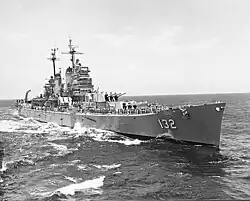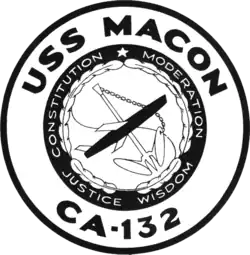 USS Macon (CA-132), a Baltimore-class heavy cruiser of the United States Navy, was laid down on 14 June 1943 by the New York Shipbuilding Corp., Camden, New Jersey; launched on 15 October 1944; sponsored by Mrs. Charles F. Bowden, wife of the mayor of Macon, Georgia; and commissioned on 26 August 1945 at Philadelphia, Captain Edward Everett Pare in command.