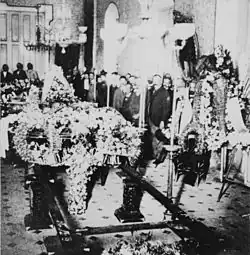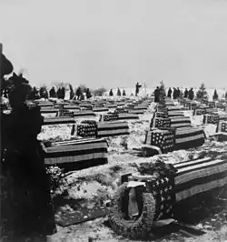 The funeral train reached Rosslyn, Virginia, on December 27. The remains were transferred to wagons, and taken to Arlington National Cemetery.[29] The funeral cortege include a cavalry unit from Fort Myer, a unit of 25 marines from the Washington Navy Yard, and a unit of bluejackets (U.S. Navy sailors) from the USS Texas.[78][79] The coffins were carried through the Sheridan Gate[80] placed under tents and an honor guard of Marines protected them overnight.[29][81]
