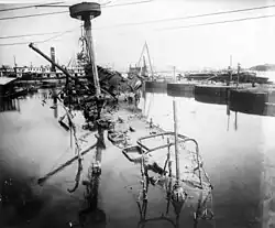 Scaffolding was erected over the stern to facilitate the removal of the mizzenmast (or aft mast) and deck fittings. These items were stored in a hut constructed on one of the cofferdams or aboard the collier USS Leonidas (AD-7).[146] On May 27, 1911, Leonidas transported the mizzenmast back to the United States.[153]