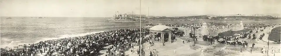 After the public viewing ended, Cuban Army artillerymen loaded the coffins aboard caissons.[198] Commander Charles F. Hughes of the Birmingham led a contingent of 300 marines and bluejackets and the North Carolina's band escorted the dead to Machina Wharf. Accompanying the funeral cortege were Brigadier General William Herbert Bixby, Army Corps Chief of Engineers; Julio de Cárdenas, Mayor of Havana; Alfredo Zayas y Alfonso, Vice President of Cuba; and members of the Cuban Cabinet. Six U.S. Navy sailors loaded the first coffins a funeral barge, while Cuban military personnel moved the remainder.[198] The barges took the remains to the North Carolina. As the North Carolina passed out of the harbor, soldiers of the Cuban Army lined the walls of La Cabaña and Morro Castle and stood at attention while a military band played a funeral dirge.[210] Hand-painted porcelain funeral wreaths, a gift of the Cuban government, were placed on the coffins.[208]