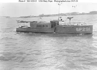 The U.S. Navy purchased Mary Pope from her owner, R. W. Bingham, on 7 July 1917[2] for World War I service as a patrol vessel. She was commissioned on 9 August 1917 as USS Mary Pope (SP-291).