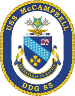 USS McCampbell (DDG-85) is an Arleigh Burke-class (Flight IIA) Aegis guided missile destroyer in the United States Navy. She is named in honor of Naval Aviator Captain David S. McCampbell, a Medal of Honor and Navy Cross recipient who was the Navy's leading ace in World War II. USS McCampbell was the 20th ship of this class to be built by Bath Iron Works at Bath, Maine, and construction began on 16 July 1999. She was launched and christened on 2 July 2000. On 17 August 2002, the commissioning ceremony was held at Pier 30 in San Francisco, California.