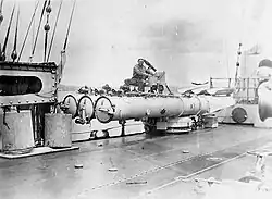 Memphis's main armament went through many changes while she was being designed. Originally she was to mount ten 6 in (150 mm)/53 caliber guns; two on either side at the waist, with the remaining eight mounted in tiered casemates on either side of the fore and aft superstructures. After America's entry into World War I the US Navy worked alongside the Royal Navy and it was decided to mount four 6-in/53 caliber guns in two twin gun turrets fore and aft and keep the eight guns in the tiered casemates so that she would have an eight gun broadside and, due to limited arcs of fire from the casemate guns, four to six guns firing fore or aft. Her secondary armament consisted of two 3 in (76 mm)/50 caliber anti-aircraft guns in single mounts. Memphis was initially built with the capacity to carry 224 mines, but these were removed early in her career to make way for more crew accommodations. She also carried two triple and two twin, above-water, torpedo tube mounts for 21 in (530 mm) torpedoes. The triple mounts were fitted on either side of the upper deck, aft of the aircraft catapults, and the twin mounts were one deck lower on either side, covered by hatches in the side of the hull.[1][6][7]