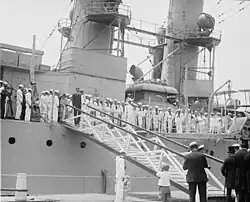 On 18 February, Memphis arrived at Algiers for President Roosevelt's last Allied conference before his return to the United States. For the next eight months, she continued to receive distinguished leaders. She participated in the first anniversary ceremonies of the Allied landings at St. Raphael and St. Tropez, southern France on 15 August, and the Navy Day festivities at Naples, Italy, on 27 October. Late in November, Memphis departed Tangier for Philadelphia, where she decommissioned on 17 December. She was struck from the Naval Vessel Register on 8 January 1946, and sold to Patapsco Scrap Co., Bethlehem, Pa. on 18 December, for scrapping following delivery on 10 January 1947.[3]
