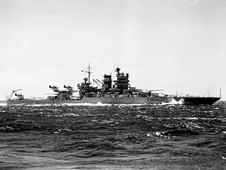 After returning to the fleet, Mississippi provided gunfire support for the Marines that went ashore at Peleliu, bombarding Japanese positions on 12 September, three days before the landing. She remained there, shelling the island for a week, before proceeding on to Manus, which had recently been taken by American forces. Assigned to the invasion fleet for the Philippines under Rear Admiral Jesse B. Oldendorf, Mississippi left Manus on 12 October and arrived off Leyte on the 19th, when she began the coastal bombardment. During the Battle of Leyte Gulf, on the night of 24 October, Mississippi and the rest of the coastal bombardment battleships decisively defeated the Japanese Southern Force under Vice Admiral Shōji Nishimura in the Battle of Surigao Strait.[5] During the battle, the Japanese warships failed to detect the American vessels with their radar. Additionally, the narrow strait forced the Japanese to steam in line ahead, while Mississippi and the other battleships were stationed at the entrance, where they were able to fire full broadsides. As a result, Nishimura was unable to avoid having his "T" crossed. In the ensuing action, American destroyers inflicted heavy damage on the Japanese force, which was then annihilated by the concentrated fire from the battleships. Mississippi, which was equipped with older fire control radar, had trouble identifying targets in the darkness, and so fired only one 12-gun salvo, after Oldendorf had given the order to cease fire. This salvo was the last fired in the action, and proved to be the last time a battleship fired its guns at another battleship.[17]