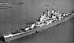 USS Mobile was a Cleveland-class light cruiser of the United States Navy, which were built during World War II. The class was designed as a development of the earlier Brooklyn-class cruisers, the size of which had been limited by the First London Naval Treaty. The start of the war led to the dissolution of the treaty system, but the dramatic need for new vessels precluded a new design, so the Clevelands used the same hull as their predecessors, but were significantly heavier. The Clevelands carried a main battery of twelve 6-inch (152 mm) guns in four three-gun turrets, along with a secondary armament of twelve 5 in (127 mm) dual-purpose guns. They had a top speed of 32.5 knots (60.2 km/h; 37.4 mph).