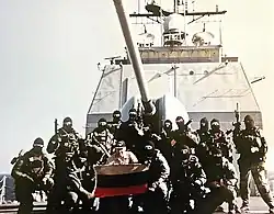 On 2 February 2000, Monterey stopped Russian tanker Volga-Neft-147. The tanker was suspected of smuggling Iraqi oil in violation of UN sanctions, as it had left the Iraqi port of Shatt al-Arab. The boarding operation was conducted by SEAL Team Two and no shots were fired as the tanker crew was cooperative. The tanker was subsequently diverted into Oman where she was confirmed to be carrying Iraqi oil illegally. After the illegal cargo was unloaded, the crew and tanker were free to leave.[5]