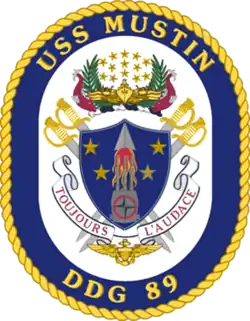 The coat of arms in full color as in the blazon, upon a white background enclosed within a dark blue oval border edged on the outside with a gold rope and bearing the inscription "USS Mustin" at the top and "DDG 89" in the base all gold.