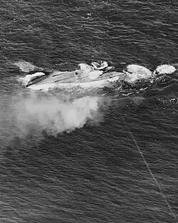 After she was thoroughly examined, Iowa and two other vessels used Nevada as a practice gunnery target 65 miles southwest of Pearl Harbor on 31 July 1948.[4][71][k] The ships did not sink Nevada, so she was given a coup de grâce with an aerial torpedo hit amidships.[89][4]