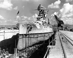 On 12 February 1942, now with Captain Harry L. Thompson (15 December 1941 – 25 August 1942) commanding,[35] Nevada was refloated and underwent temporary repairs at Pearl Harbor so she could get to Puget Sound Navy Yard for major repairs and modernization. Then under command of Captain Howard F. Kingman (25 August 1942 – 25 January 1943),[35] the overhaul was completed in October 1942, and it changed the old battleship's appearance so she slightly resembled a South Dakota from a distance.[71][72]