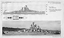 In addition to all of this, Nevada had maximum armor over critical areas, such as the magazines and engines, and none over less important places, even though previous battleships had armor of varying thickness depending on the importance of the area it was protecting. This radical change became known as the "all or nothing" principle, which most major navies later adopted for their own battleships.[17][19][25] With this new armor scheme, the armor on the battleship was increased to 41.1% of the displacement.[26]