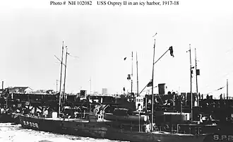 ![]() USS Osprey II (foreground) in an icy port with other section patrol vessels during the winter of 1917-1918.