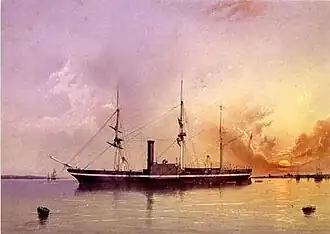 From 1869 to 1886, she was attached to the North Atlantic Squadron and was flagship from 15 September 1869 until 30 December 1870.[6] On 24 August 1873, Powhatan was caught in a storm at Halifax, Nova Scotia, Canada. She was driven from her moorings at the Cunard wharf across to the ordnance wharf.[7] She served as flagship again from 4 July 1877 until 10 December 1879. During this period, three Powhatan crewman earned the Medal of Honor for rescuing fellow sailors from drowning: Landsman George W. Cutter at Norfolk, Virginia, on 27 May 1872; Seaman Joseph B. Noil at Norfolk on 26 December 1872; and Coxswain William Anderson on 28 June 1878.[6]
