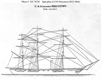 From July to September 1853 Princeton served as flagship of the Eastern Squadron under the command of Commodore William Shubrick, which was responsible for protecting fisheries off the coast of Nova Scotia. Princeton next returned to New York City upon completion of this assignment, where she remained until 31 October 1854 and then got underway for duty in the Gulf of Mexico and the West Indies. There she spent several weeks searching for the ill-fated USS Albany, a sail-powered sloop of war lost with 210 hands.[1] She returned to Norfolk 10 June 1855 and was placed in ordinary. In 1857 Princeton was taken to Philadelphia, Pennsylvania, where she was stationed as a receiving ship until 9 October 1866. Princeton was sold in 1866.