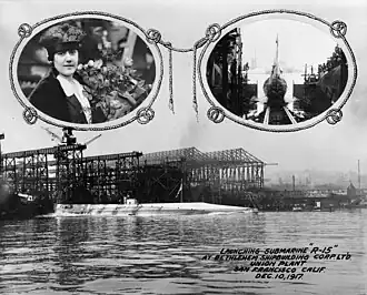 ![]() A collage of photographs showing the launching of USS R-15 at the Bethlehem Shipbuilding Corporation, Ltd., Union Plant, at San Francisco, California. The main photograph shows R-15 after launching; the left insert is a picture of the ship's sponsor, Mrs. Thales S. Boyd; the right insert shows R-15 sliding down the building ways.
