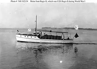 This article incorporates text from the public domain Dictionary of American Naval Fighting Ships. The entry can be found here.- Department of the Navy Naval History and Heritage Command Online Library of Selected Images: Civilian Ships: Regis II (American Motor Boat, 1902). Served as USS Regis II (SP-1083) in 1917-1919
