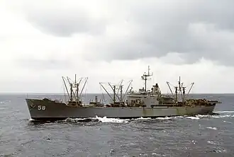 Rigel was fitted out with an amidships helicopter platform in 1961, thus providing her with a vertical replenishment capability. Two years later, that platform was replaced with one on her fantail to simplify the pilots' problems when landing aboard or conducting replenishments. Rigel served until decommissioned on 23 June 1975.