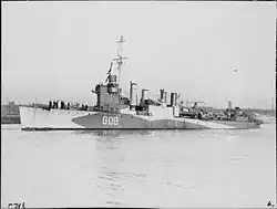 Assigned to the 17th Destroyer Division, Newark participated in escort duty for the 1st Minelaying Division operating in the Irish Sea and for the Iceland ferry service. She suffered minor bomb damage in an air attack at Belfast on the night of 4–5 May 1941 but resumed active duty that August. While in company with Southern Prince 25 August 1941, Newark was hit by a torpedo forward and had to be escorted into Belfast. Newark was modified for trade convoy escort service by removal of three of the original 4"/50 caliber guns and one of the triple torpedo tube mounts to reduce topside weight for additional depth charge stowage and installation of hedgehog.[1] Following completion of repairs in May 1942, Newark rejoined the 17th Destroyer Division. She probably damaged a German submarine 31 May 1942 while cruising south of Iceland and assisted Castleton in rescuing survivors of U-464 on 20 August 1942.
