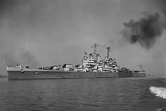 Santa Fe was laid down at the New York Shipbuilding Co. at Camden, New Jersey, on 7 June 1941. She was launched of 10 June 1942, and after completing fitting out, she was commissioned on 24 November. Captain Russell S. Berkey served as the ship's first commanding officer. She thereafter conducted her shakedown cruise and initial training off the East Coast of the United States into early 1943, before sailing for the Pacific Ocean, where she joined the forces engaged in the Pacific Theater of World War II. She arrived in Pearl Harbor, Hawaii, on 22 March and proceeded from there to the Aleutian Islands. She arrived in Alaskan waters on 20 April, and six days later she took part in a bombardment of Japanese-held Attu Island. She participated in patrols off the Aleutians for the next four months during the Aleutian Islands campaign, and she shelled Kiska on 6 and 22 July before American forces landed on the island the following month. She provided gunfire support to the forces that went ashore there on 15 August. Ten days later, Santa Fe left the area and arrived back in Pearl Harbor on 1 September.[3]