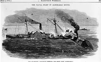 In March, Sassacus returned to Hampton Roads for repairs and then proceeded to the Washington Navy Yard to add two 12 pounder Dahlgren rifles to her battery. She departed Washington, D.C., on 15 April, and left Hampton Roads a week later for duty in the North Carolina sounds where, on 19 April, the ironclad ram CSS Albemarle had spearheaded a joint Confederate sea/land offensive, sinking Union double-ender USS Southfield, and helping to wrest Plymouth, North Carolina, from Union hands. On 26 April, Sassacus crossed the bar into North Carolina's inland waters and was assigned to Albemarle Sound, where other United States Navy ships awaited the reappearance of the dreaded Southern ram. Albemarle, accompanied by troop-carrying steamers CSS Cotton Plant and CSS Bombshell, reemerged from Roanoke Run on the afternoon of 5 May bent on attacking New Bern, North Carolina. The Union ships in the vicinity slowly fell back while the Union transport Trumpeter raced away to carry word of the Southern ram's advance to Captain Melancton Smith, the senior Union Naval officer in the sounds. Smith in USS Mattabesett, followed by Sassacus, USS Wyalusing and USS Whitehead, immediately got underway and dashed toward Confederate Captain James W. Cooke's little task force. Soon after Albemarle opened fire, Sassacus, Mattabesett and Wyalusing concentrated their fire on Bombshell and forced the little steamer to surrender. Meanwhile, Cotton Plant withdrew up the Roanoke River. Then Commander Roe "ordered full steam and open throttle" and headed Sassacus straight for the ram. Sassacus struck Albemarle's starboard broadside. The double-ender was damaged by the collision and by a shot from the ram which hit her starboard boiler. Escaping steam killed one fireman outright and scalded others who died in the next few days. Albemarle suffered only superficial damage.