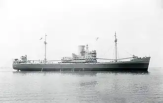 In October and November 1943 Saturn made one transatlantic crossing to England, and then resumed supply trips between the US and Caribbean until September 1944.[3] In April 1944 Norfolk Navy Yard converted her to a provision store ship and on 10 April she was reclassified AF-40.[3] While in the Norfolk Navy Yard on April 27, 1944, a fire broke out in the hold, resulting in the death of 16 men working on the ship. This accident remained classified until 2010.[5] On 2 September 1944 Saturn sailed to the Mediterranean carrying supplies for Operation Dragoon, the invasion of southern France.[3] After one trip to Iceland and several voyages to the Caribbean, she made another trip to Oran, French Algeria in March 1945.[3] Saturn resumed her supply voyages up and down the Atlantic Coast until arriving at Norfolk, Virginia on 1 July 1946.[3]