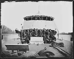 Saugus remained on the James for the next month and contributed boats for clearing the river of "torpedoes" after the Confederate ships were scuttled on the night of 2/3 April and Richmond occupied. On 5 April, the ship, now under the command of Lieutenant B. F. Day, and Mahopac were ordered report to the Washington Navy Yard.[16] After the assassination of President Abraham Lincoln on 15 April, eight of the suspected conspirators were incarcerated aboard Saugus and the monitor Montauk. On 30 April, they were transferred off the ships to the Arsenal Penitentiary.[6]