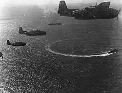 Once repairs were finished, she once again returned to the waters off of Okinawa, along with five other escort carriers. She resumed operations on 9 June, and her aircraft were assigned the duty of neutralizing the five airfields on Miyako-jima and Ishigaki-jima, from which kamikaze aircraft were operating. She bombed the airfields between 14 and 16 June, returning again from 18 to 22 June.[10] On 22 June, she left, bound for the West Coast, where she would undergo overhaul. She was moored at U.S. Repair Base, San Diego when the Japanese surrender was announced.[7]