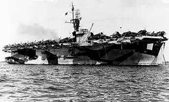 After finishing her duties as a replacement carrier for the Philippines campaign, she operated off of Pearl Harbor as a training carrier for the next three months. During her tenure as a replacement carrier, Captain Austin Wadsworth Wheelock took over as commanding officer of the ship. On 22 April, she departed Pearl Harbor, bound for Okinawa. Stopping at Guam, she arrived on 7 May and immediately began operations. Between 7 May and 16 May, her aircraft conducted 352 sorties supporting the Battle of Okinawa, bombing Japanese defenses and equipment. On 16 May, her aviation gasoline tanks were damaged by a collision, forcing her to retire back to Guam for repairs.[9]
