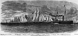 Farragut was preparing for a campaign against New Orleans, Louisiana, and Sidney C. Jones was order to sail to the Gulf of Mexico; she reached Ship Island in early March, later entering the Mississippi River on March 18 via Pass A L'Outre.[4] Sidney C. Jones was part of Commander David Dixon Porter's Mortar Flotilla.[6] On April 18, Porter's mortar schooners moved upriver towards the Confederate positions at Fort Jackson and Fort St. Philip, with their masts camouflaged with brush.[7] Porter divided his command into three parts; Sidney C. Jones was assigned to the rearmost one, Lieutenant Walter W. Queen's Second Division, along with five other vessels. This division was assigned a location with a clear view of both forts, and of the three parts was the most exposed to Confederate fire. At a range of a minimum of 3,680 yards (3,360 m), each schooner fired a mortar shot at the Confederate forts every ten minutes, in the beginning of the Battle of Forts Jackson and St. Philip.[8] One of the ships in Sidney C. Jones's division, USS Maria J. Carlton, was sunk by Confederate fire on the morning of April 19, and Porter ordered the division to move to a more sheltered position.[9] The firing increased in intensity on April 20.[10] During the firing, Sidney C. Jones was commanded by Acting Master J. Duncan Graham.[11]
