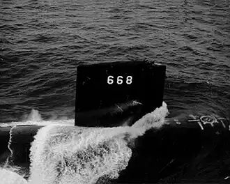 ![]() USS Spadefish (SSN-668) on her sea trials off Virginia in 1969.