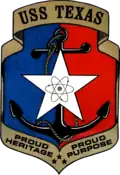 The official crest of USS Texas CGN 39 was designed by Martha Bell, a freelance graphic designer from Texas. The colors—red, white, and blue—represent the state flag of Texas. The anchor and the fouled line symbolize the Navy, while the Lone Star signifies the state of Texas. The atoms and orbits within the Lone Star represent the nuclear power characteristics of the ship. The three stars at the bottom represent the past United States ships named "Texas". The motto, "Proud Heritage, Proud Purpose", refers to the history and legacy of those ships, and their purpose: defense of the United States.