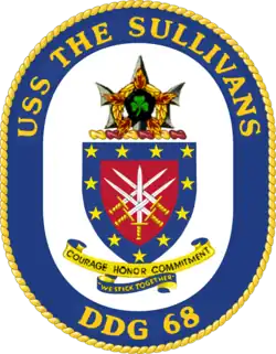 The dark blue and gold, on the shield of the coat of arms, represent the sea and excellence. They are also the US Navy's traditional colors. Red is emblematic of courage and sacrifice. The five interlaced swords honor the five Sullivan brothers killed in action during World War II and commemorate their spirit of teamwork and patriotism. The upright points of the swords allude to the present ship's combat readiness and her missile system. The border reflects unity and the eleven stars represent the battle stars earned by the first The Sullivans (DD-537); nine for World War II and two for the Korean War. The trident on the crest, a symbol of sea prowess, symbolizes DDG-68's modern warfare capabilities; the AEGIS and vertical launch system. The fireball underscores the Guadalcanal campaign where the five brothers were killed in action while serving on USS Juneau, and highlights the firepower of both past and present USS The Sullivans. The inverted wreath, a traditional symbol of the ultimate sacrifice, is also in memory of the Sullivan brothers. The shamrock recalls the Irish heritage. The arms, on the seal, are blazoned in full color upon a white oval enclosed by a dark blue collar edged on the outside with a gold rope and bearing the name "USS THE SULLIVANS" at the top and "DDG 68" in the base in gold.[23]
