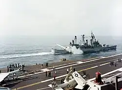 On 29 November 1965, however, she headed back to the western Pacific for the first deployment during which her primary mission was to support the American and South Vietnamese forces fighting the communists. On that tour of duty, she served as the flagship for the Commander Cruiser-Destroyer Group, 7th Fleet. In that capacity the ship operated in the South China Sea and in the Gulf of Tonkin providing naval gunfire support for the troops ashore and supporting carrier air operations by conducting search and rescue missions for downed aircrews. She punctuated tours of duty in the combat zone with port visits to Yokosuka, Japan, Hong Kong, and the Philippine ports of Manila, Davao City, and Subic Bay. Her six-month deployment ended on 28 May 1966, when Topeka reentered Long Beach.[1]