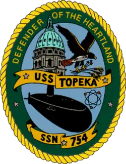 USS Topeka (SSN-754) is a Los Angeles-class submarine and the third United States Navy vessel to be named for Topeka, Kansas. The contract to build her was awarded to the Electric Boat Division of General Dynamics Corporation in Groton, Connecticut, on 28 November 1983 and her keel was laid down on 13 May 1986. She was launched on 23 January 1988, sponsored by Elizabeth Dole, and commissioned on 21 October 1989.[3]