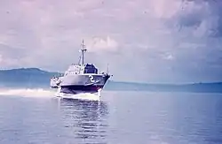 USS Tucumcari (PGH-2) was a Boeing-built hydrofoil. Named after Tucumcari, New Mexico, it was the basis for the technology used in the subsequent Pegasus-class patrol boats and the Jetfoil ferries. Its unique feature was a waterjet propulsion and a computer-controlled fully submerged foil configuration of one foil at the bow and foils on the port and starboard sides. The Tucumcari was one of two prototype boats contracted by the Navy under project SCB 252[1] for the purpose of evaluating the latest hydrofoil technology. The second boat was the rival Grumman-built USS Flagstaff.
