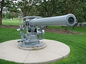 Ward's number-three 4"/50 caliber gun was removed when she was converted to a high speed transport. In 1943, the year of the Minnesota Centennial, it was installed as a memorial at the Minnesota State Capitol in St. Paul, when the men who fired it on 7 December 1941 were members of the Minnesota Naval Reserve. A plaque containing a listing of the naval reservists from Saint Paul who served aboard Ward is now displayed in the St. Paul City Hall on the third floor between the council and mayoral offices, in an area also containing the ship's bell from the cruiser Saint Paul. The last surviving member of the gun crew from the morning of 7 December, Alan Sanford, died in January 2015.[10]