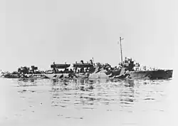 Waters entered the Puget Sound Navy Yard on 19 December 1942 to begin conversion and later that month was redesignated APD-8. During the modifications, her forward boilers were removed to make room for the troops she would carry while her torpedo tubes came off to accommodate landing craft and their davits. Though the ship retained her four-gun main battery configuration, she swapped her obsolete single-purpose 4-inch (102 mm) guns for more up-to-date dual-purpose 3-inch (76 mm) guns. Her antiaircraft defenses were further augmented by the addition of several single 20 mm mounts. She completed conversion in February and returned to San Diego on 10 February.[1]